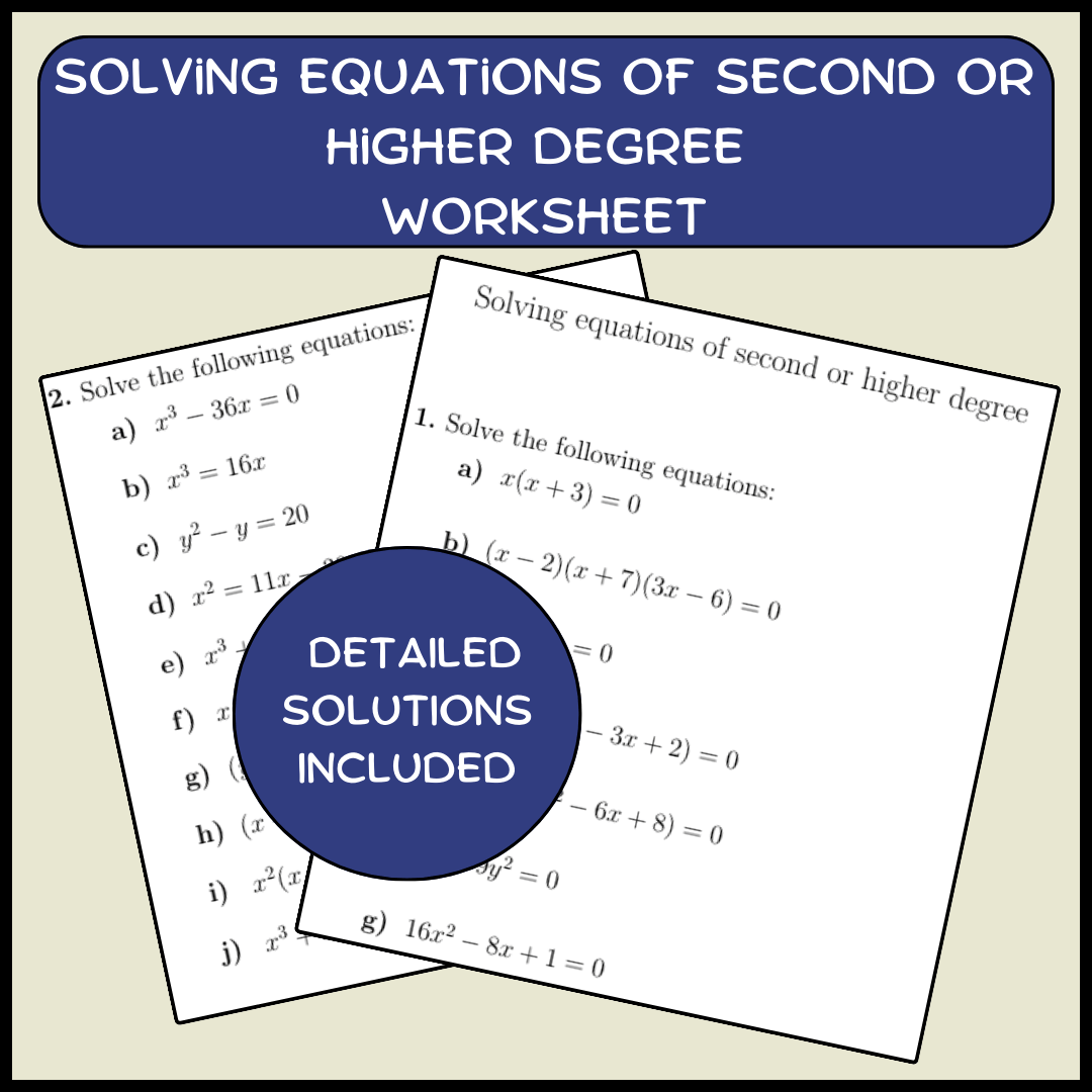Solving equations of second or higher degree worksheet (with solutions)